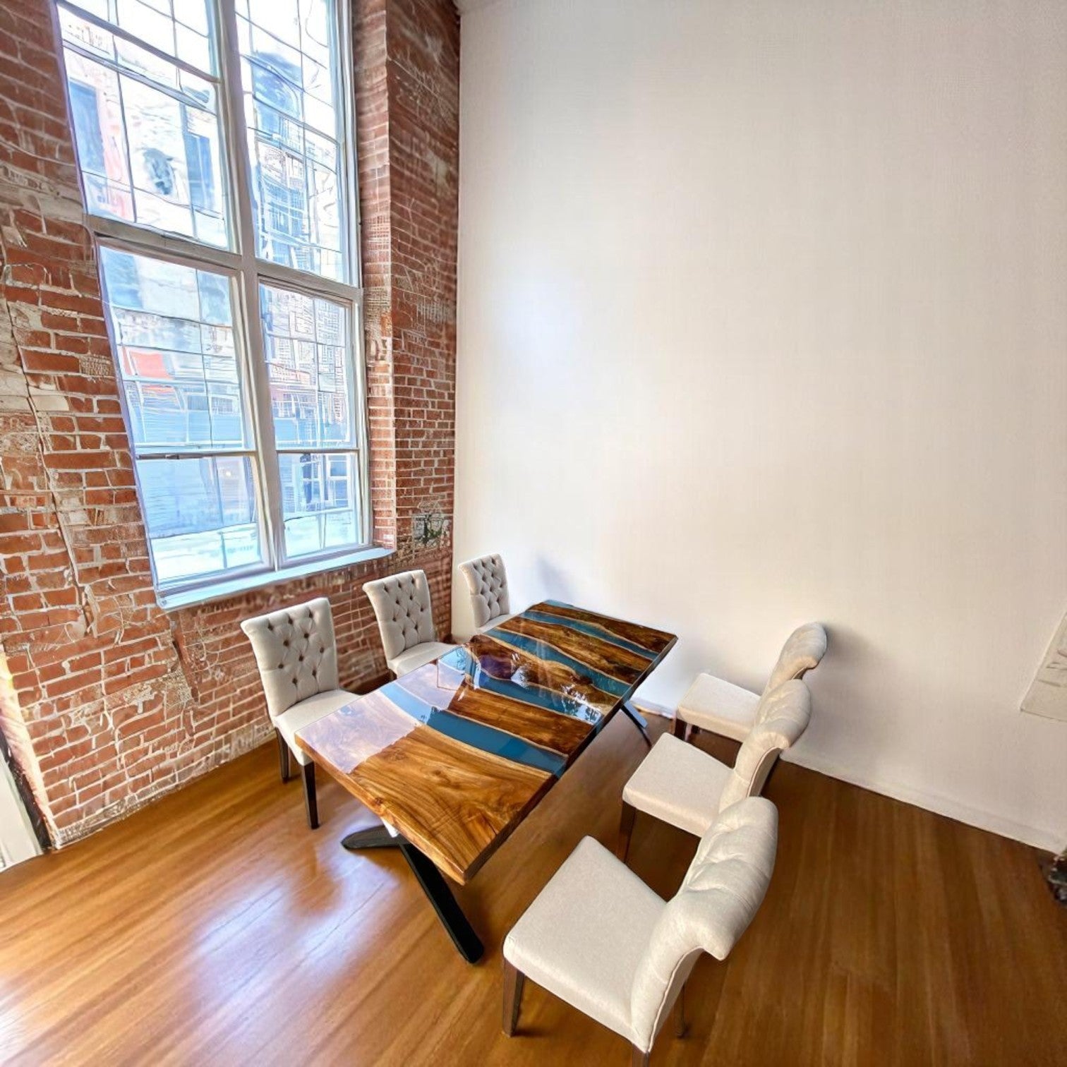 The bold electric blue resin river weaves through the natural contours of the teakwood, creating a flowing design that mimics nature’s raw beauty. Finished with a high-gloss resin seal, this table shimmers under light, turning every angle into a visual highlight. It’s a conversation starter and a showstopper in any dining space.